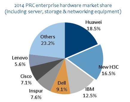 圖:2014年中國(guó)企業(yè)業(yè)務(wù)硬件市場(chǎng)份額(包括服務(wù)器、存儲(chǔ)和網(wǎng)絡(luò)設(shè)備)