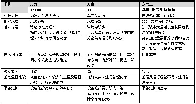 滲瀝液處理中,深度處理是難點(diǎn)和重點(diǎn),也是保證達(dá)標(biāo)及運(yùn)行管理的關(guān)鍵步驟,關(guān)于深度處理方案,做常見(jiàn)三種方案的比選,見(jiàn)表1