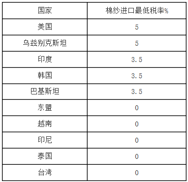 印度作為“一帶一路”上的重要大國、全球最大的棉花生產國、全球最大的棉紗出口國之一,減免關稅政策的出臺勢必對該國棉花產業(yè)產生重大影響。據印度業(yè)內人士透露,印度總理訪華期間中國領導人表示將促進中印之間的棉紗貿易,并承諾將下調印度棉紗進口關稅。據某位業(yè)內人士稱,關稅的減免及棉紗進口無配額限制,這兩大優(yōu)勢或將促進中國印巴紗進口量的再次突破,將會促進國內棉花與紡企的快速轉型。印度承諾將下調印度棉紗進口關稅。下圖是中國從各國家、地區(qū)進口棉紗的最低稅率。