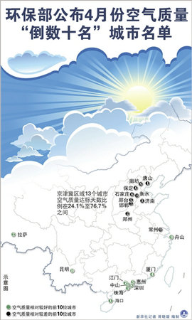 5月25日,環(huán)保部向外界通報了今年4月京津冀、長三角、珠三角區(qū)域及直轄市、省會城市和計劃單列市等74個城市的空氣質(zhì)量狀況。唐山、鄭州、濟南、保定、邢臺、石家莊、邯鄲、廊坊、常州和衡水,作為4月空氣質(zhì)量相對較差的后10位城市登上“榜單”。