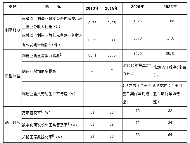 到2025年,制造業(yè)整體素質(zhì)大幅提升,創(chuàng)新能力顯著增強(qiáng),全員勞動生產(chǎn)率明顯提高,兩化(工業(yè)化和信息化)融合邁上新臺階。重點(diǎn)行業(yè)單位工業(yè)增加值能耗、物耗及污染物排放達(dá)到世界先進(jìn)水平。形成一批具有較強(qiáng)國際競爭力的跨國公司和產(chǎn)業(yè)集群,在全球產(chǎn)業(yè)分工和價(jià)值鏈中的地位明顯提升。