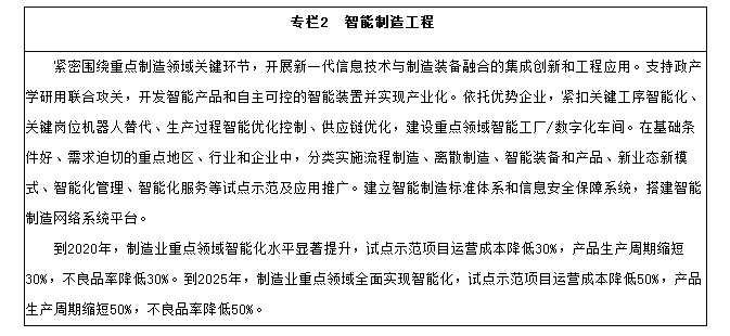 到2020年,基本實(shí)現(xiàn)工業(yè)化,制造業(yè)大國地位進(jìn)一步鞏固,制造業(yè)信息化水平大幅提升。掌握一批重點(diǎn)領(lǐng)域關(guān)鍵核心技術(shù),優(yōu)勢領(lǐng)域競爭力進(jìn)一步增強(qiáng),產(chǎn)品質(zhì)量有較大提高。制造業(yè)數(shù)字化、網(wǎng)絡(luò)化、智能化取得明顯進(jìn)展。重點(diǎn)行業(yè)單位工業(yè)增加值能耗、物耗及污染物排放明顯下降。