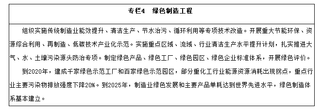 加大先進(jìn)節(jié)能環(huán)保技術(shù)、工藝和裝備的研發(fā)力度,加快制造業(yè)綠色改造升級;積極推行低碳化、循環(huán)化和集約化,提高制造業(yè)資源利用效率;強(qiáng)化產(chǎn)品全生命周期綠色管理,努力構(gòu)建高效、清潔、低碳、循環(huán)的綠色制造體系。