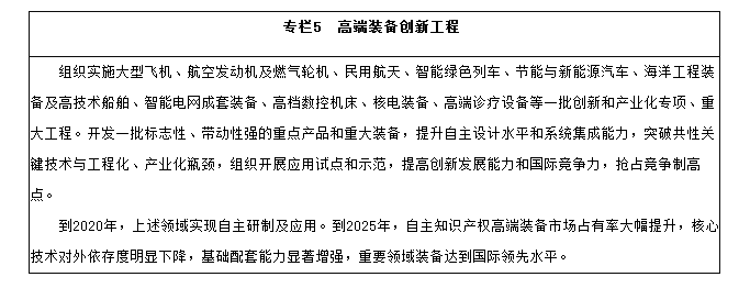 航空裝備。加快大型飛機(jī)研制,適時(shí)啟動寬體客機(jī)研制,鼓勵國際合作研制重型直升機(jī);推進(jìn)干支線飛機(jī)、直升機(jī)、無人機(jī)和通用飛機(jī)產(chǎn)業(yè)化。突破高推重比、先進(jìn)渦槳(軸)發(fā)動機(jī)及大涵道比渦扇發(fā)動機(jī)技術(shù),建立發(fā)動機(jī)自主發(fā)展工業(yè)體系。開發(fā)先進(jìn)機(jī)載設(shè)備及系統(tǒng),形成自主完整的航空產(chǎn)業(yè)鏈。