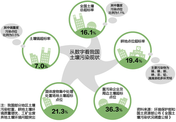 去年4月,環(huán)境保護部、國土資源部聯(lián)合發(fā)布了《全國土壤污染狀況調(diào)查公報》。公布的數(shù)據(jù)顯示,全國土壤總的點位超標(biāo)率為16.1%,其中輕微、輕度、中度和重度污染點位比例分別為11.2%、2.3%、1.5%和1.1%。