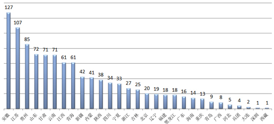 在1043個(gè)項(xiàng)目中,安徽以127個(gè)項(xiàng)目居首,江蘇以107個(gè)項(xiàng)目居次席,此外排名前十的省市依次是貴州(85個(gè)),山東(72個(gè)),甘肅云南均為71個(gè),江西青海均為62個(gè),新疆(42個(gè)),內(nèi)蒙古(41個(gè))。