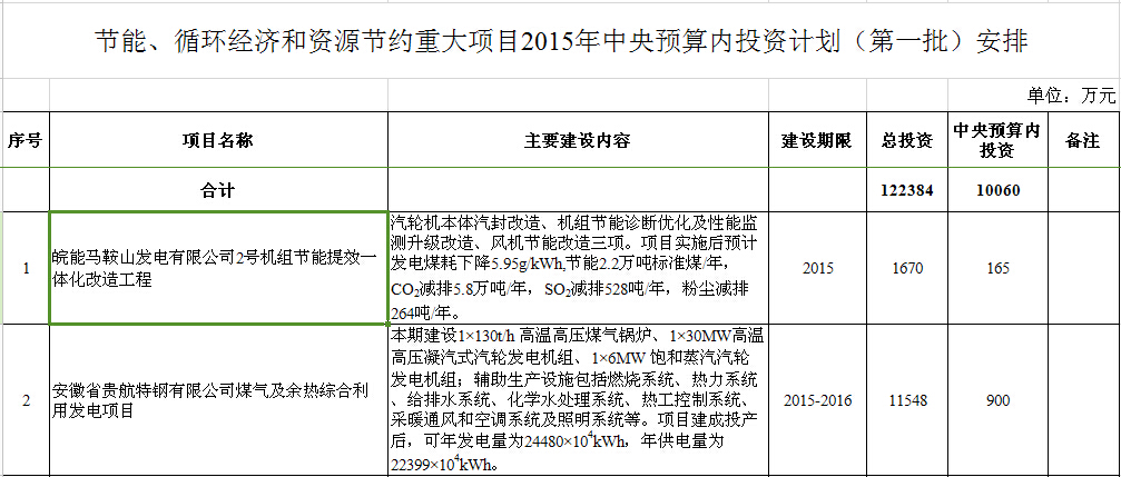 安徽省節(jié)能、循環(huán)經(jīng)濟(jì)和資源節(jié)約重大項(xiàng)目2015年中央預(yù)算內(nèi)投資計(jì)劃(第一批)(名單)