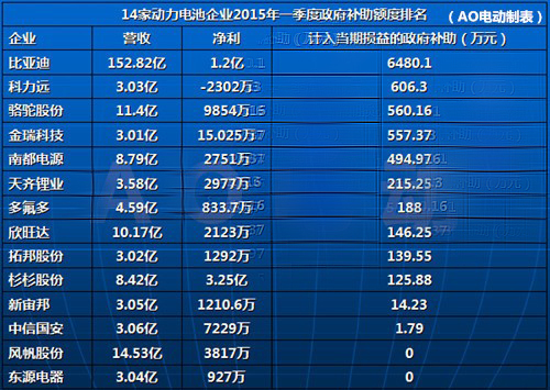 從筆者統(tǒng)計的2015年14家動力電池企業(yè)一季度財報中看到,計入當(dāng)期損益的政府補(bǔ)助在部分企業(yè)利潤中占據(jù)了相當(dāng)大的比例。14家動力電池企業(yè)中有12家在一季度獲得了政府補(bǔ)助,補(bǔ)助金額合計達(dá)9529.85萬元。其中比亞迪股份獲得的補(bǔ)助金額高達(dá)6480.1萬元,科力遠(yuǎn)606.3萬元,駱駝股份560.16萬元,金瑞科技557.37萬元。此外,南都電源、天齊鋰業(yè)、多氟多、欣旺達(dá)、拓邦股份、杉杉股份、新宙邦和中信國安都獲得了額度不等的政府補(bǔ)助。