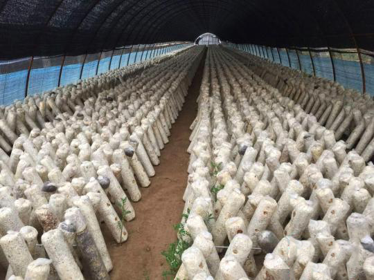 菇棚內(nèi)的菌棒六月份就可以出菇了(張帆 攝)