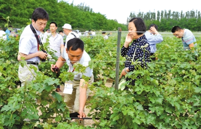 5月30日,代表們?cè)阢y川市永寧縣德龍葡萄滴灌高效節(jié)水項(xiàng)目區(qū)觀摩節(jié)水設(shè)施。(記者 左鳴遠(yuǎn) 計(jì)鵬 攝)