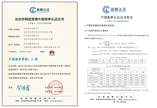 2015年5月14日,華為智能組串式光伏逆變器SUN2000全系列產品通過了第三方權威檢測機構北京鑒衡認證中心測試認證,檢測結果顯示華為全系列逆變器產品的中國效率均超過98%。其中,SUN2000-40KTL機型在所有參與測試的廠家產品中效率最高,中國效率高達98.41%,為目前所有通過測試的集中式、組串式逆變器中效率之首。同時通過中國效率認證的華為同系列產品還包括SUN2000-33KTL,SUN2000-28KTL,SUN2000-20KTL,SUN2000-10KTL,均被評定為中國效率最高等級A級。華為負責人表示,逆變器中國效率高充分證明了華為產品技術過硬,但逆變器效率最高不是我們追求的目標,系統(tǒng)效率和性價比最高才是我們真正追求的目標和努力的方向。只有系統(tǒng)效率提升,才能為客戶創(chuàng)造最大的價值。