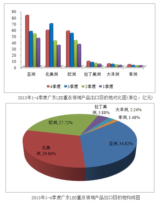 從LED重點(diǎn)領(lǐng)域產(chǎn)品出口目的地分布情況來看,2013年,廣東LED重點(diǎn)領(lǐng)域產(chǎn)品主要出口地仍是亞洲、北美洲和歐洲。其中銷往北美洲的出口額是205.43億元,占出口總額的29.86%。