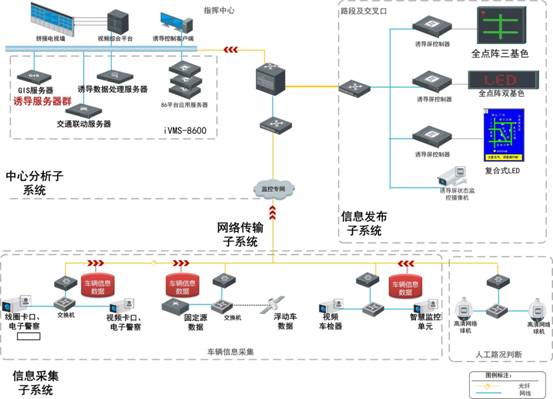 交通誘導(dǎo)系統(tǒng)由四個子系統(tǒng)構(gòu)成,即信息采集子系統(tǒng),網(wǎng)絡(luò)傳輸子系統(tǒng)、中心分析子系統(tǒng)和信息發(fā)布子系統(tǒng)。前端采集的車輛信息經(jīng)過中心分析計(jì)算后得出路況交通狀態(tài),也可以通過視頻監(jiān)控人工判斷路況交通狀態(tài),并在外場交通誘導(dǎo)屏予以公布,實(shí)現(xiàn)道路路況交通狀態(tài)的實(shí)時通報。