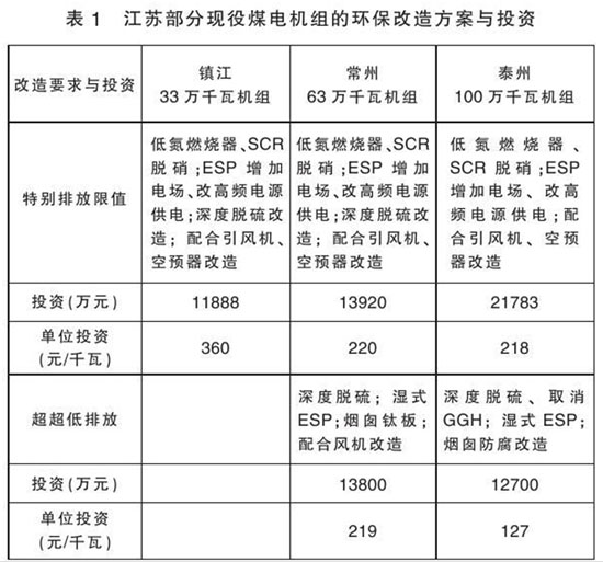 對于現(xiàn)役煤電機(jī)組的環(huán)保改造,不同電廠環(huán)保設(shè)施基礎(chǔ)不同,環(huán)保改造的內(nèi)容也有所不同。如表1給出了江蘇省3家電廠3臺(tái)煤電機(jī)組的改造方案與投資比較。