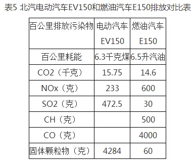 前面已經(jīng)分析了,北汽電動汽車EV150百公里折合耗煤約6.3千克,同款燃油汽車E150耗油6.5升。有了這個數(shù)字,就可以對比排放數(shù)字了。燃燒每千克標(biāo)煤排放2.5千克CO2,75克SO2,37克NOx,0.68千克粉塵;燃燒1升汽油排放2.25千克CO2,還排放氮氧化物、碳?xì)浠衔?、一氧化碳、顆粒物等,但網(wǎng)上不能查到單位排放量。只能從2010年的總污染物排放數(shù)字中估算每臺車的排放量,如下表。