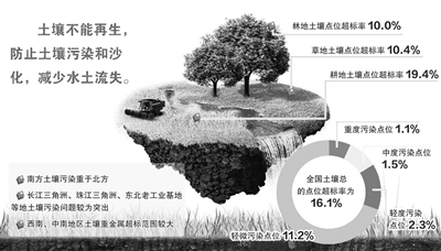 首次全國土壤污染狀況調(diào)查(2005年4月~2013年12月)結(jié)果顯示,全國土壤總的點(diǎn)位超標(biāo)率為16.1%,其中輕微、輕度、中度和重度污染點(diǎn)位比例分別為11.2%、2.3%、1.5%和1.1%。耕地土壤點(diǎn)位超標(biāo)率為19.4%,其中輕微、輕度、中度和重度污染點(diǎn)位比例分別為13.7%、2.8%、1.8%和1.1%。林地、草地和未利用地土壤點(diǎn)位超標(biāo)率分別為10.0%、10.4%和11.4%。