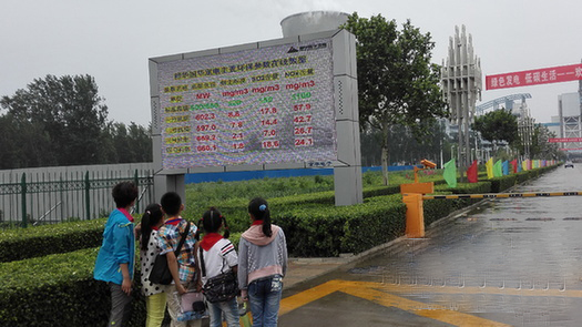 日前,定州國華電廠在廠區(qū)門口設(shè)立了電子顯示屏,實(shí)時(shí)公布每臺(tái)燃煤機(jī)組的污染物排放監(jiān)測(cè)數(shù)據(jù)。圖為學(xué)生們?cè)陔娮语@示屏前觀看電廠污染物排放情況。
