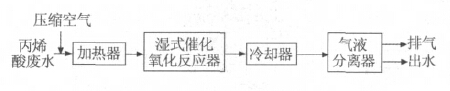 催化濕式氧化技術(shù)是在傳統(tǒng)濕式氧化基礎(chǔ)上加入催化劑的一種處理廢水的方法,相對(duì)于傳統(tǒng)濕式氧化技術(shù),它的反應(yīng)溫度以及反應(yīng)壓力較低,反應(yīng)分解能力更高,對(duì)設(shè)備腐蝕性小、運(yùn)行成本低。王向榮等采用催化濕式氧化技術(shù)處理丙烯酸廢水,進(jìn)水COD在40g/L,出水COD<100mg/L,處理費(fèi)用在100~200元/t。工藝流程如圖2所示。