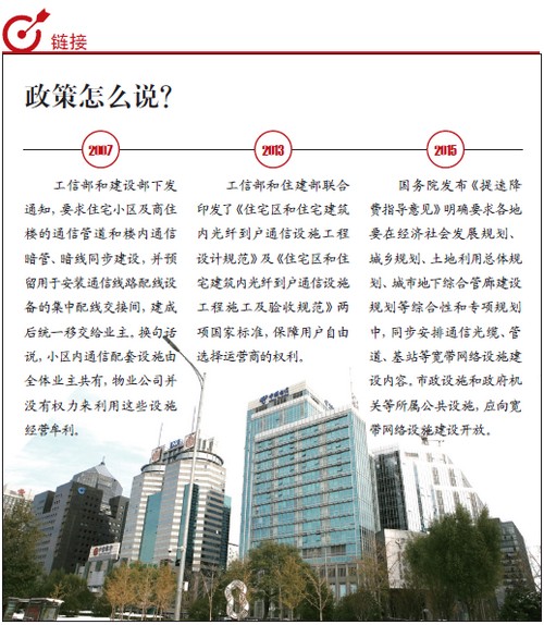 實(shí)際上關(guān)于進(jìn)場(chǎng)問(wèn)題早有政策規(guī)定。2007年和2013年,工信部和住建部曾相繼出臺(tái)相關(guān)文件,破除小區(qū)物業(yè)壟斷,保障用戶選擇權(quán)。但在實(shí)際執(zhí)行中落地效果難以達(dá)到預(yù)期。隨著國(guó)務(wù)院發(fā)布提速降費(fèi)相關(guān)政策,對(duì)保障運(yùn)營(yíng)商網(wǎng)絡(luò)建設(shè)做了細(xì)化。