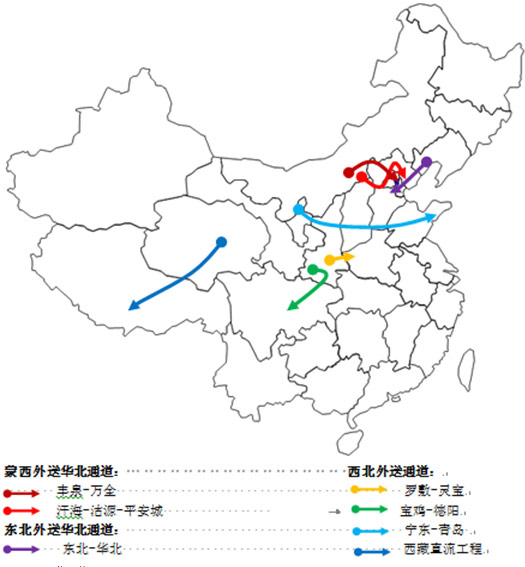 三北地區(qū)已建成主要外輸通道(截至2012年末)