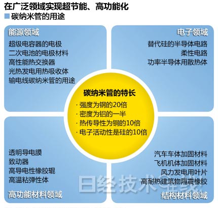 CNT的電特性(易通電等)、機(jī)械特性(強(qiáng)度等)、熱傳導(dǎo)性都遠(yuǎn)遠(yuǎn)超過(guò)其他材料。使用加入了CNT的復(fù)合材料,可以在廣泛的領(lǐng)域開發(fā)出新型節(jié)能且多功能的設(shè)備。