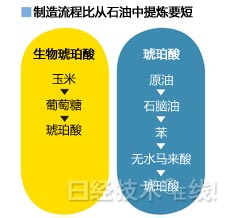 生物琥珀酸的制備方法是,使從玉米中提取的糖分(葡萄糖)在菌類的作用下發(fā)酵。與利用原油制造相比工序更少,因此可低成本制造。新工廠鄰近北美被稱為“玉米帶”的一大玉米產(chǎn)地,可低價(jià)采購(gòu)從玉米中提取的葡萄糖。