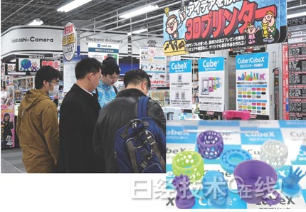 在日本最大規(guī)模的家電商場(chǎng)——友都八喜多媒體秋葉原店,乘扶梯上二樓后,首先映入眼簾的是家用3D打印機(jī)賣場(chǎng)。3D打印機(jī)的價(jià)格仍然高達(dá)十幾萬日元,因此每月只能賣出幾臺(tái),但出于愛好想使用的人在穩(wěn)步增加。