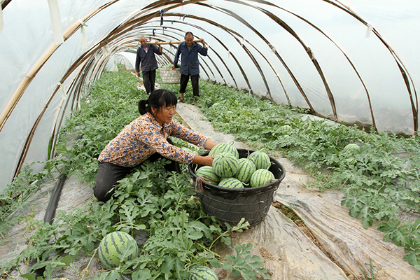 6月21日,房縣紅塔鎮(zhèn)塘溪村農家婦女鄭旭蓮(前)正在節(jié)水滴灌大棚釆收西瓜。2014年10月,鄭旭蓮在縣水利技術人員的指導下,建起40畝大棚節(jié)水滴灌水利設施,引種新疆優(yōu)質高產麒麟西瓜,實現致富夢想。目前,鄭旭蓮的滴灌大棚西瓜已經進入上市高峰,平均每天銷售西瓜2800公斤,預計今年實現收入達60多萬元。
