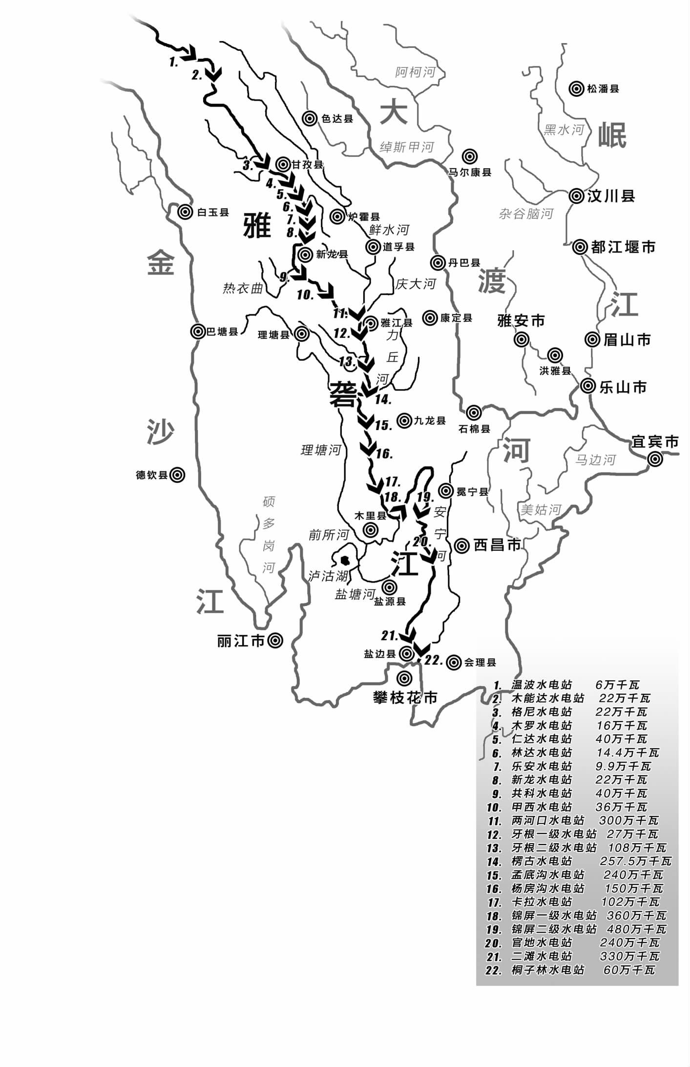 資料顯示,雅礱江流域水能理論蘊(yùn)藏量為3372萬(wàn)千瓦,其中干流水能理論蘊(yùn)藏量2200萬(wàn)千瓦,支流1144萬(wàn)千瓦,全流域可開(kāi)發(fā)的水能資源為3000萬(wàn)千瓦。根據(jù)梯級(jí)電站規(guī)劃與布局,其干流流域共將建成22座梯級(jí)電站,它們被分為上、中、下游三個(gè)河段進(jìn)行開(kāi)發(fā)。
