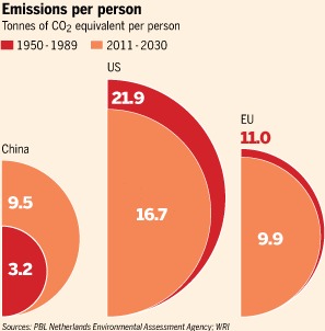 2012年,中國(guó)排放了近100億噸二氧化碳,超過(guò)美國(guó)和歐盟的總和,占全球總排放的近三分之一。盡管擁有13億人口,但中國(guó)的人均排放量仍高于法國(guó)、意大利和西班牙,幾乎等于歐盟平均水平。