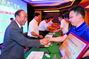 圖為李壽生等領(lǐng)導(dǎo)向獲獎單位頒發(fā)能效領(lǐng)跑者獎牌。(記者 張育 攝)