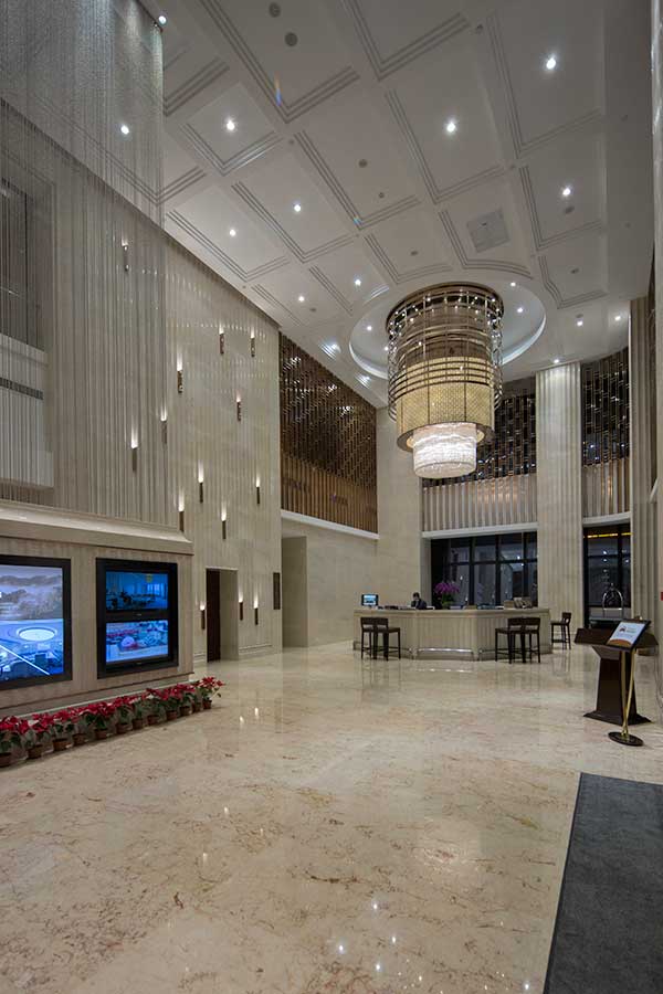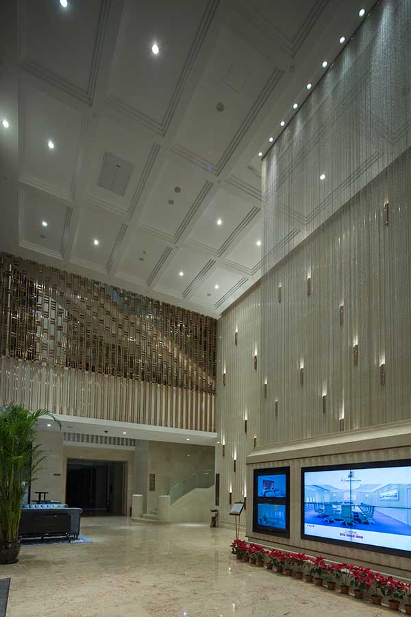 酒店大堂照明既要明亮,又要展現出酒店的人文氣息,從酒店大堂建筑布局即可窺見其融合地域文化和時代潮流的氣息。正對門口的墻上,錯落的豎行裝飾在燈光的烘托下,如奧運火炬般給人驚喜之感,能讓人感受到酒店追求更好的強烈理念。酒店巧借國際通用的運動圖騰,寓涵追求卓越的品質。而這一部分,對于燈光的光斑有著極高要求。