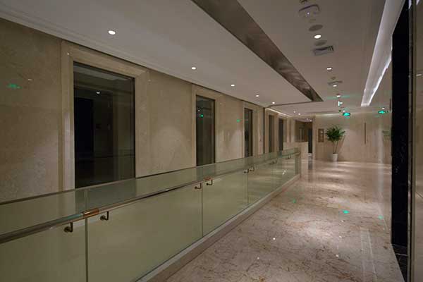 酒店的大堂根據其深度不足、寬度足夠的情況,科學布局,營造空闊視覺效果。采用鏤空裝飾手法,豐富層次,制造驚喜。結合燈光的巧妙應用,避免大堂照明明暗差別過大,還能減少顧客等待過程中產生的煩躁與不滿。