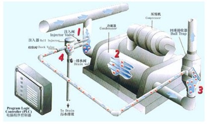 (1)電腦程序控制器啟動清洗循環(huán),將注射閥門打開,控制特殊球進入冷凝器循環(huán)系統(tǒng);