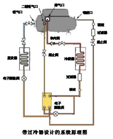 (4)雙級(jí)壓縮機(jī)補(bǔ)氣增焓+過(guò)冷器技術(shù),充分發(fā)揮雙級(jí)壓縮效果,利用獨(dú)立過(guò)冷器提高冷媒過(guò)冷效果,提高單位冷媒制冷能力;
