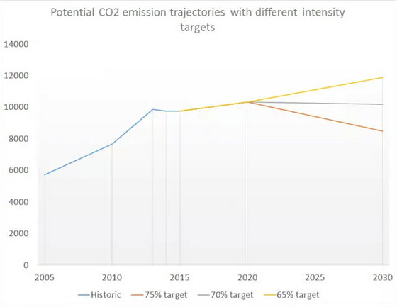 在包括了去年11月《中美氣候變化聯(lián)合聲明》中宣布的碳排放不晚于2030達(dá)到峰值和2020年非化石能源目標(biāo)達(dá)到20%的既有承諾基礎(chǔ)上,中國(guó)在今天提交的“自主貢獻(xiàn)文件”中的后2020氣候目標(biāo)中加入了新的碳排放強(qiáng)度下降目標(biāo)[ii]、森林蓄積量目標(biāo)等。其中最值得注意的是碳排放強(qiáng)度下降目標(biāo),以2005年為基準(zhǔn)年在2030年下降60-65%。