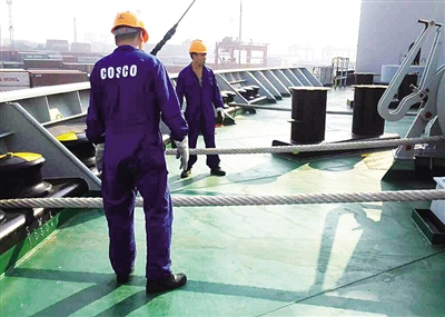 下圖 中遠(yuǎn)“西班牙號(hào)”的水手們在整潔干凈的甲板上工作。