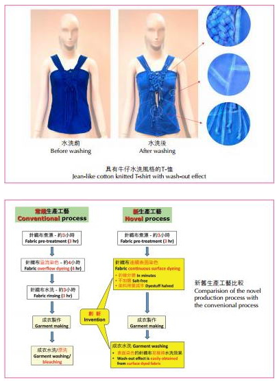 世界上首創(chuàng)成功應(yīng)用活性染料對(duì)棉針織布進(jìn)行表面染色,并制造具有時(shí)尚牛仔服裝水洗效果的T-恤.還具有低碳環(huán)保生產(chǎn)的優(yōu)點(diǎn)。