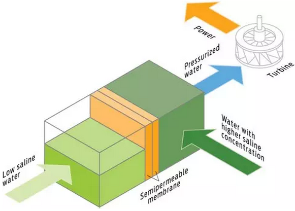 藍色能源概念于1954年由英國工程師R E Pattle首次提出,它有時也會被稱為“滲透能量”,因為它因滲透現象而產生了能量。