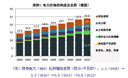 清潔能源價(jià)普遍較高(水電除外),如風(fēng)電、氣電、核電、太陽(yáng)能每千瓦時(shí)分別比煤電高約0.19元、0.35元、0.02元、0.50元,將會(huì)結(jié)構(gòu)性推動(dòng)電價(jià)總體水平的上升。這一趨勢(shì)已在德國(guó)等歐盟國(guó)家得到印證。