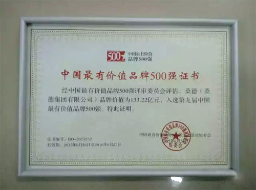 2015年6月28日,第九屆中國最有價值品牌500強評選活動在廣州舉行,經評選活動專家委員會評估,桑德集團入選第九屆中國最有價值品牌500強,品牌價值133.22億元,持續(xù)領銜環(huán)保行業(yè)。