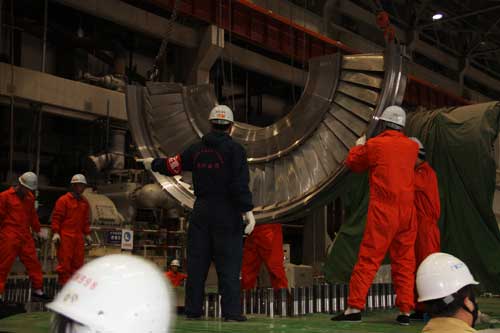 西寧火電項(xiàng)目1號(hào)機(jī)汽機(jī)扣蓋現(xiàn)場(chǎng) 記者代洪 攝