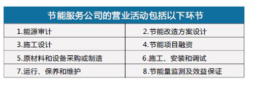 《合同能源管理技術(shù)通則》第3.3條,對(duì)節(jié)能服務(wù)公司的定義是,“提供用能狀況診斷、節(jié)能項(xiàng)目設(shè)計(jì)、融資、改造(施工、設(shè)備安裝、調(diào)試)、運(yùn)行管理等服務(wù)的專業(yè)化公司。”從定義看,節(jié)能服務(wù)公司的營(yíng)業(yè)活動(dòng)包括以下環(huán)節(jié):