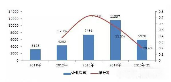 圖1 2011-2015年第1季度我國(guó)LED年度出口企業(yè)數(shù)量