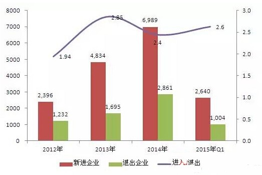 2015年第1季度的出口額較2014年第1季度的出口額同比下降8%,出口企業(yè)數(shù)為5920家,同比增長(zhǎng)20%,2015年第1季度新進(jìn)入的企業(yè)為2640家左右,退出的企業(yè)為1004家,進(jìn)入的企業(yè)是退出的企業(yè)的2倍左右。說(shuō)明出口貿(mào)易的競(jìng)爭(zhēng)激烈。
