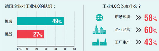 同時,認(rèn)為“工業(yè)4.0”對中小企業(yè)構(gòu)成機(jī)會的占比已經(jīng)高達(dá)49%,還有27%的中小企業(yè)認(rèn)為“工業(yè)4.0”會帶來挑戰(zhàn)。