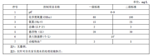 根據(jù)農(nóng)村生活污水主要來源、水質(zhì)特征等,《標(biāo)準(zhǔn)》確定了pH值、化學(xué)需氧量、氨氮、總磷、懸浮物、糞大腸菌群、動植物油等7項主要控制指標(biāo)及限值。重要水系源頭、重要湖泊集水區(qū)等水環(huán)境功能重要地區(qū)執(zhí)行較高的一級標(biāo)準(zhǔn),其他地區(qū)執(zhí)行二級標(biāo)準(zhǔn)。