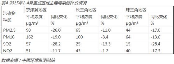1-4月,按照《環(huán)境空氣質(zhì)量標(biāo)準(zhǔn)》(GB3095-2012)評(píng)價(jià),京津冀、長(zhǎng)三角、珠三角區(qū)域及直轄市、省會(huì)城市和計(jì)劃單列市共74個(gè)城市主要污染物排放量有所下降。PM2.5、PM10、SO2、NO2平均濃度與上年同期相比均有所下降,其中SO2平均濃度下降幅度最大,同比降低20.2%;PM2.5平均濃度同比降低15.8%。
