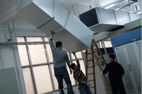 圖為施工人員正在安裝空調(diào)送風(fēng)系統(tǒng)的靜壓箱