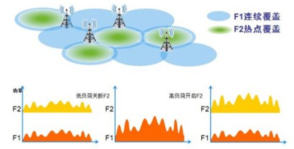 由于雙載波同覆蓋可以充分利用現(xiàn)有頻率資源,提高系統(tǒng)吞吐量從而提升用戶感知,因此其被認(rèn)為是未來(lái)一種很重要的組網(wǎng)方式。大唐移動(dòng)智能載波關(guān)斷技術(shù)主要針對(duì)的就是雙載波同覆蓋的組網(wǎng)場(chǎng)景,在網(wǎng)絡(luò)較閑、小區(qū)業(yè)務(wù)量較低的情況下,通過(guò)載波關(guān)斷技術(shù)啟動(dòng)綠色節(jié)能模式。